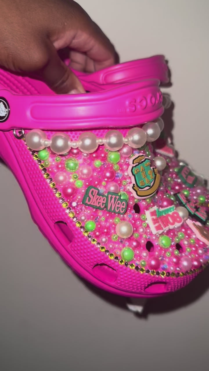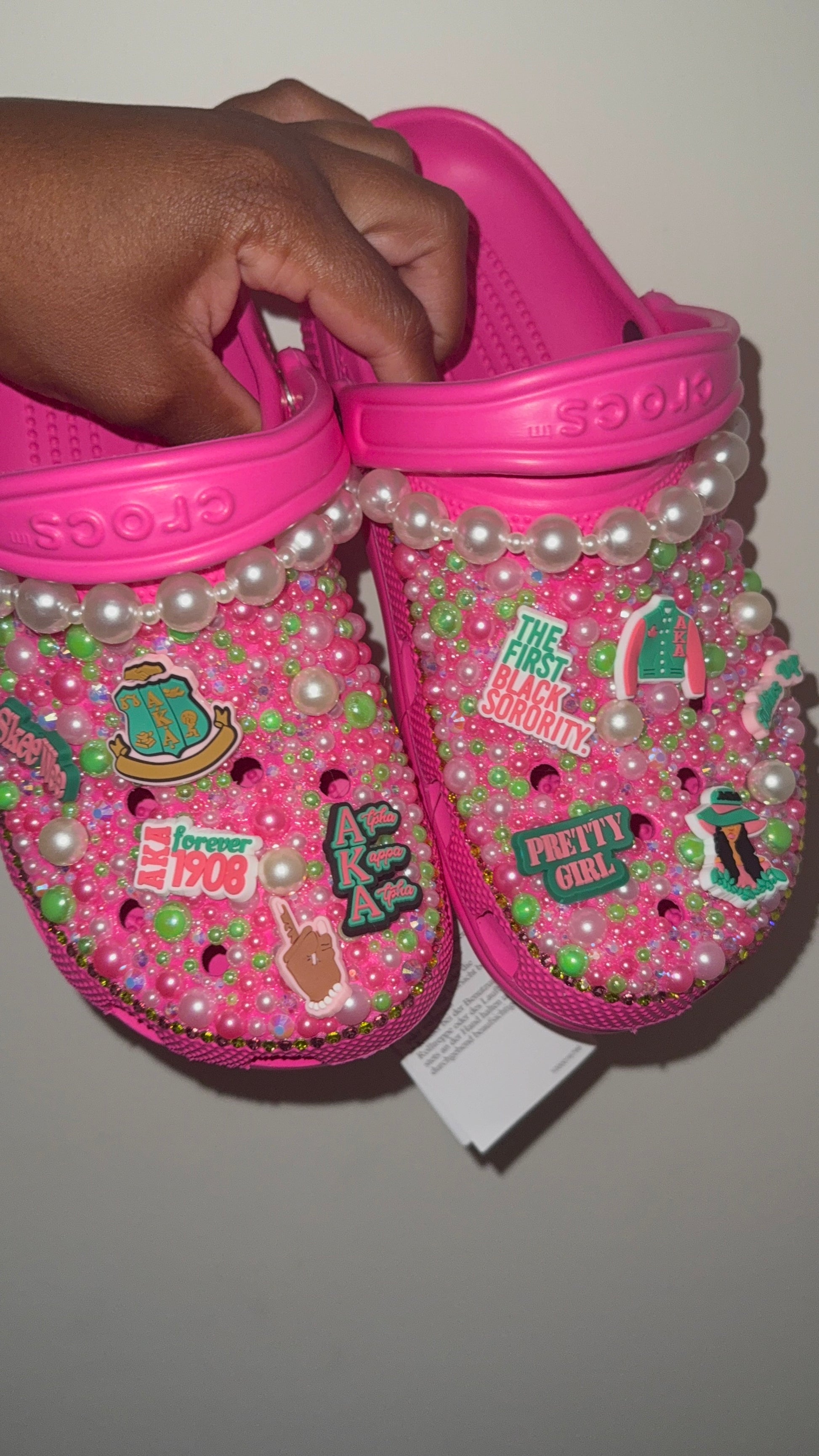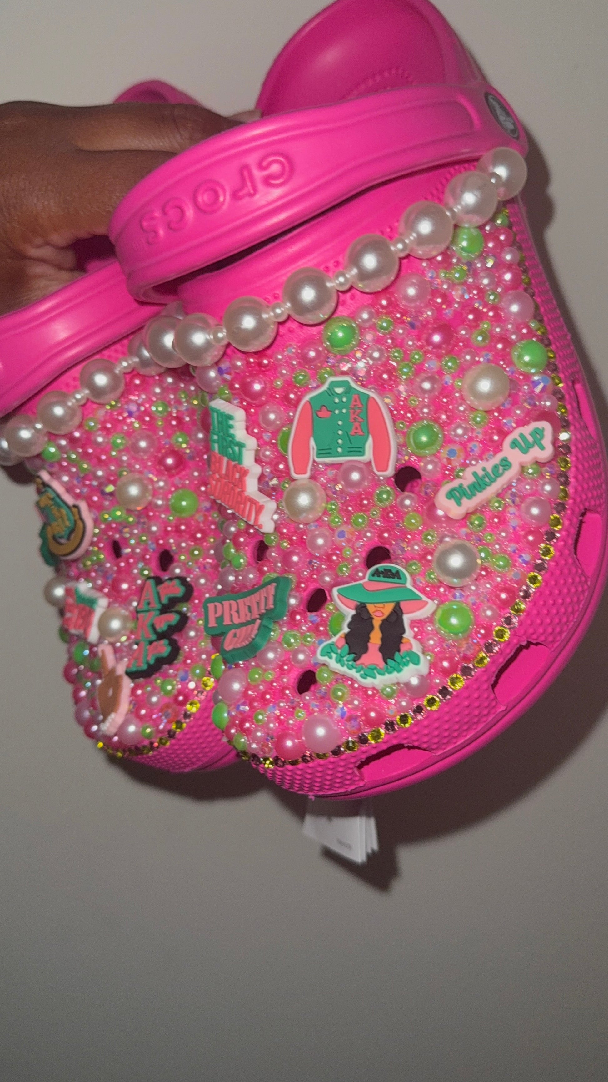 "Introducing AKA Bling X Pearls Crocs, the custom-designed shoe for girly fashionistas. Adorned with glimmering pearls, these crocs are the perfect blend of style and comfort. Be the envy of all with these fashionable shoes."